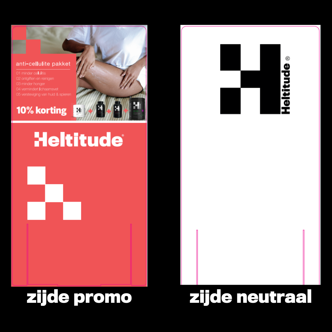 De achterzijde van de top kaart kan gebruikt worden om algemene Heltitude producten in de kijker te plaatsen,